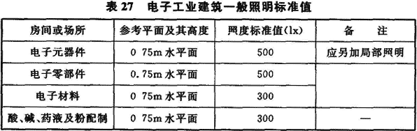 12.2.1 根據(jù)現(xiàn)行國家標(biāo)準(zhǔn)《建筑照明設(shè)計(jì)標(biāo)準(zhǔn)》GB 50034—2004中的規(guī)定,照度值均為作業(yè)面或參考平面上的維持平均照度值。該標(biāo)準(zhǔn)第5章中規(guī)定了各類建筑的照明標(biāo)準(zhǔn)值,現(xiàn)將其中有關(guān)電子工業(yè)的部分摘錄于表27中。