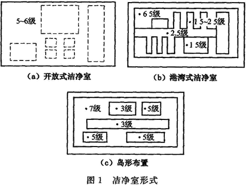 1 根據(jù)電子產(chǎn)品生產(chǎn)工藝要求,空氣潔凈度等級和平面或空間布置要求,微電子廠房潔凈室布置形式一般有隧道式或港灣式、開放式、島形布置等,見圖1。據(jù)調(diào)查表明,集成電路芯片制造用潔凈室一般采用隧道式和開放式,其中隧道式潔凈室主要用于5″、6″芯片制造廠,生產(chǎn)工藝設(shè)備跨潔凈生產(chǎn)區(qū)和設(shè)備維護(hù)區(qū),潔凈生產(chǎn)區(qū)對潔凈度要求嚴(yán)格,而維護(hù)區(qū)的空氣潔凈度等級較低。目前8″、12″芯片制造工廠普遍采用開放式潔凈室加微環(huán)境(minienvironment)的方式,將芯片制造過程對空氣潔凈度要求十分嚴(yán)格的硅片加工過程(1~4級)布置在微環(huán)境裝置內(nèi),而開放式潔凈室的潔凈度等級只需5~6級,這種潔凈室形式既可做到工藝布置的靈活性,又可做到減少建設(shè)投資和降低能量消耗、降低運(yùn)行費(fèi)用等。