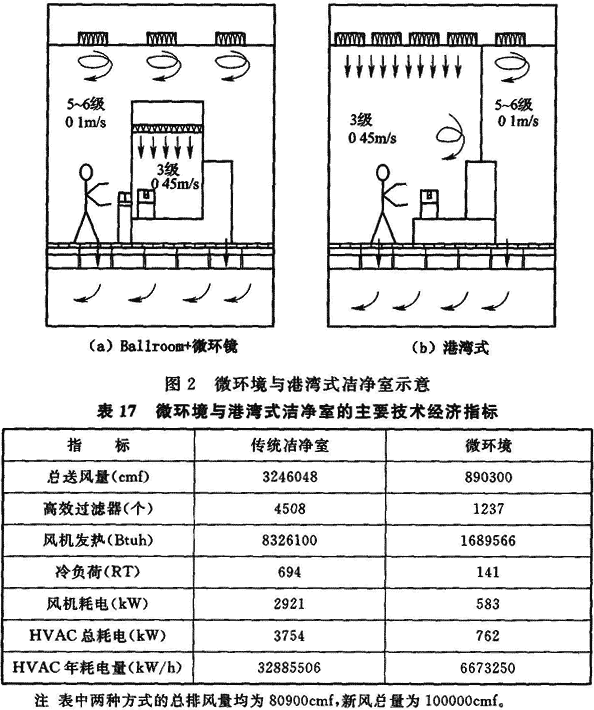 4.2.3 電子工廠潔凈廠房是能源消耗量大、建設(shè)投資大的廠房,為了使?jié)崈魪S房的建設(shè)獲得較好的節(jié)能和經(jīng)濟(jì)效益,從潔凈室型式的選擇開始就應(yīng)該認(rèn)真地分析比較,選擇既滿足電子產(chǎn)品生產(chǎn)工藝要求,又能做到降低能耗、減少建設(shè)投資和降低運(yùn)行費(fèi)用等需求。目前在超大規(guī)模集成電路工廠采用微環(huán)境類型的潔凈室,是一種能滿足以上要求的混合流潔凈室。圖2是Ballroom+微環(huán)境潔凈室與港灣式潔凈室的對比圖示,圖中(a)將要求大面積的單向流平均風(fēng)速為0.45m/s變化為只有微環(huán)境范圍內(nèi)小面積,而大部分空間均采用5~6級、平均風(fēng)速約為0.1m/s。兩種方式的主要技術(shù)經(jīng)濟(jì)數(shù)據(jù)的比較見表17,從表中數(shù)據(jù)可見:Ballroom+微環(huán)境潔凈室能量消耗少,也可做到總體建設(shè)投資少,所以當(dāng)空氣潔凈度等級要求十分嚴(yán)格時(shí),宜采用此種類型。