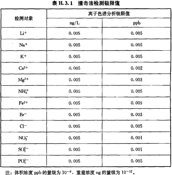 H.3.1 撞擊采樣法適用于檢測空氣中的陰陽離子(Li+、Na+、K+、Ca2+、Mg2+、Fe2+、Br-、Cl)的濃度。檢測限值可按表H.3.1執(zhí)行。