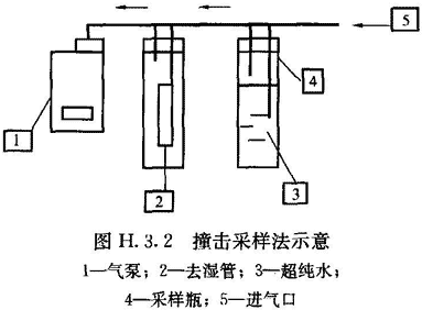 2 采樣瓶內注入30mL超純水,用管子按圖H.3.2所示將各部分連接起來。去濕管是為了保證沒有水滴被吸入采樣泵。