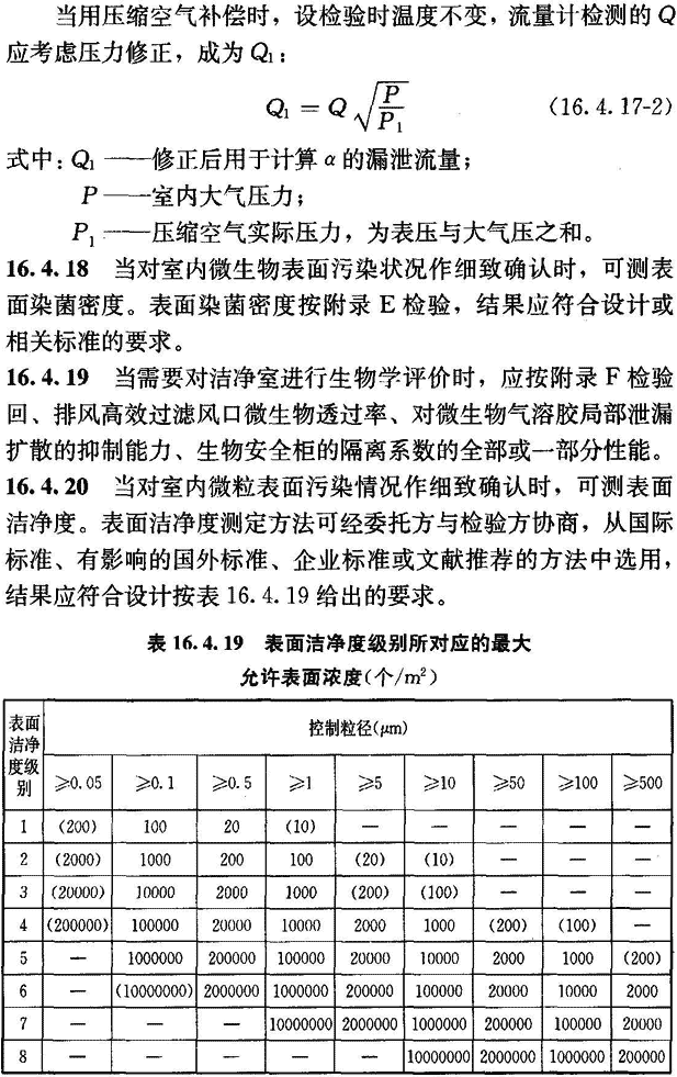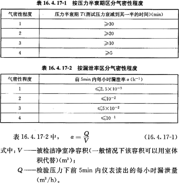 16.4.17 當(dāng)對(duì)潔凈室的嚴(yán)密性有特殊要求時(shí),可測(cè)其圍護(hù)結(jié)構(gòu)嚴(yán)密性。圍護(hù)結(jié)構(gòu)嚴(yán)密性按附錄G檢驗(yàn)。檢驗(yàn)結(jié)果應(yīng)符合設(shè)計(jì)要求。當(dāng)設(shè)計(jì)無(wú)明確要求時(shí),可在以下兩表的任何一種評(píng)定方法中任選一種方法,兩表中最大測(cè)試壓力設(shè)定為500Pa。