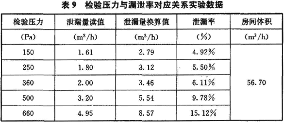 實(shí)驗(yàn)條件:空氣壓縮機(jī)充氣壓力為0.2MPa,分別將潔凈室壓力保持在150Pa、250Pa、360Pa、500Pa和660Pa進(jìn)行恒壓法氣密性實(shí)驗(yàn),測(cè)試過(guò)程中溫度基本保持不變,忽略溫度因素影響,受檢驗(yàn)儀器量程(浮子流量計(jì)最小量程為1.6m3h)限制,檢驗(yàn)壓力小于150Pa時(shí)沒(méi)有做漏泄率實(shí)驗(yàn)。實(shí)驗(yàn)結(jié)果如表9所示,其中泄漏量讀值為流量計(jì)讀數(shù)平均值,泄漏量換算值為泄漏量讀值經(jīng)修正后的數(shù)值??梢钥闯?,檢驗(yàn)壓力(即潔凈室壓差)越大,潔凈室漏泄率增長(zhǎng)越迅速。