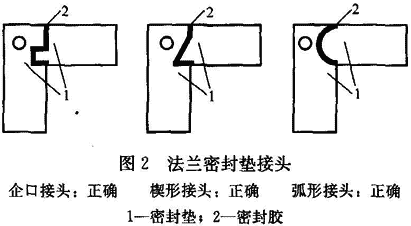 5.3.3 有的安裝單位對(duì)法蘭密封墊的接頭未做成階梯或企口形,采用簡(jiǎn)單的對(duì)接,壓縮時(shí)會(huì)出現(xiàn)縫隙。有的密封墊未用膠粘接,壓緊后產(chǎn)生位移,造成漏風(fēng)。除去條文的示例外,還有以下形式可參考(圖2):