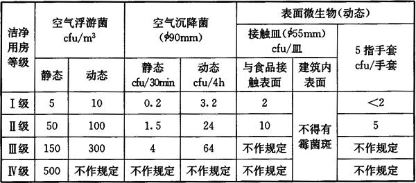 4.2.1 食品工業(yè)潔凈用房等級應(yīng)符合表4.2.1的規(guī)定: