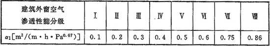 式中:α1——外門窗縫隙滲風系數[m3(m·h·pab)],當無實測數據時,可根據建筑外窗空氣滲透性能分級的相關標準,按表F.0.3采用;