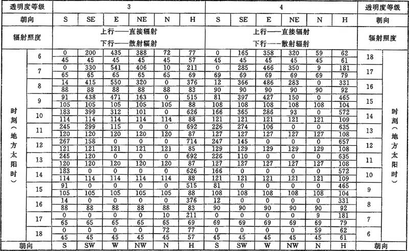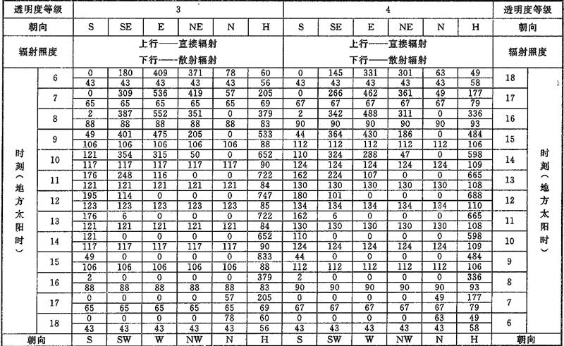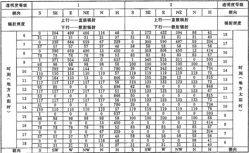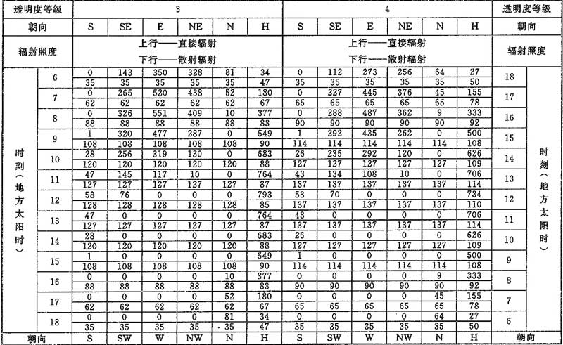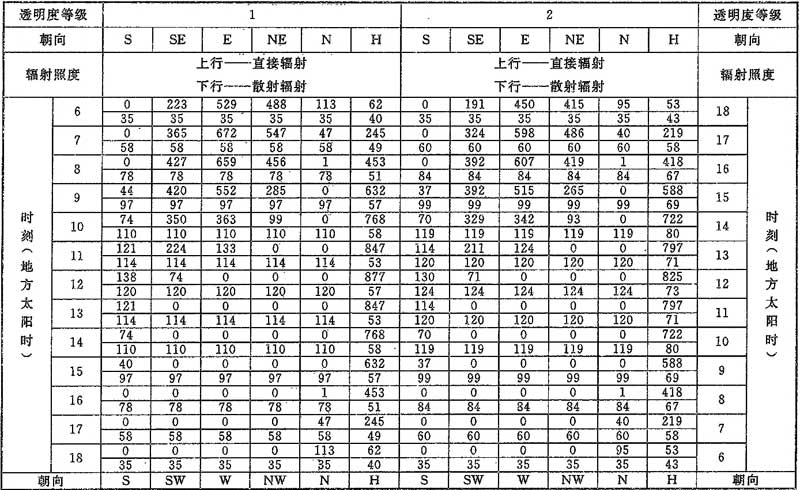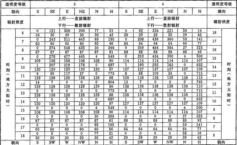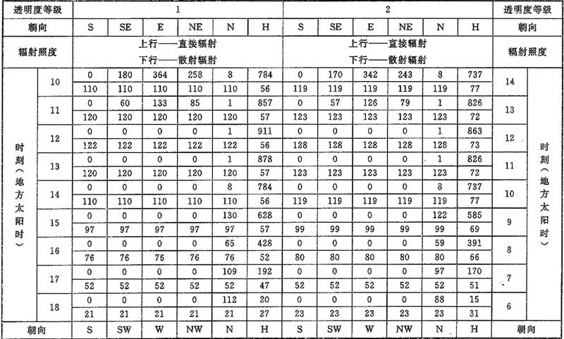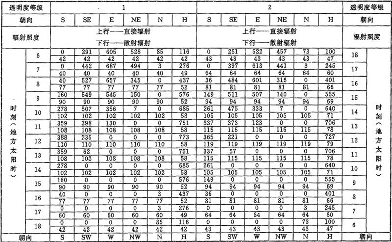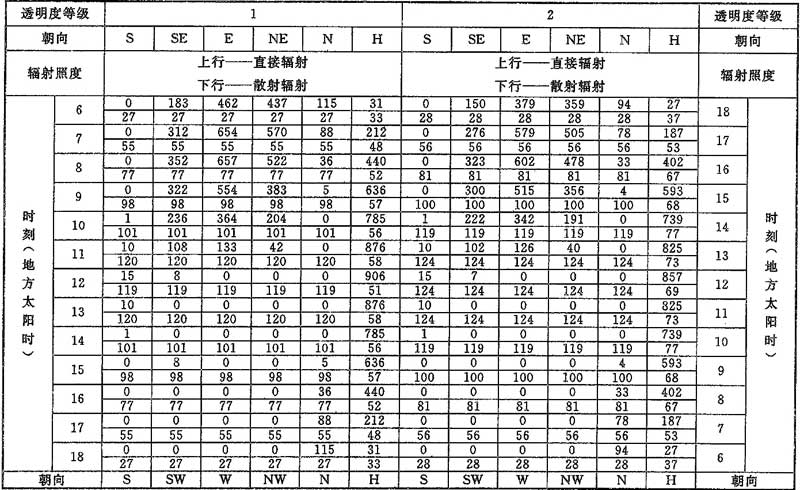 D.0.1 計算夏季空調(diào)冷負荷時,透過建筑物各朝向垂直面與水平面標準窗玻璃的太陽直接輻射照度和散射輻射照度應按表D.0.1-1~表D.0.1-7采用。