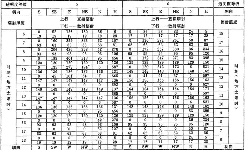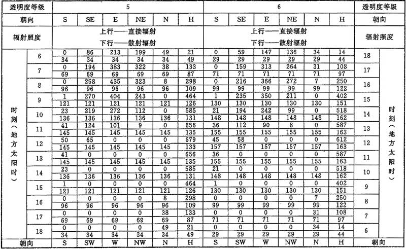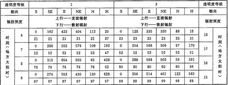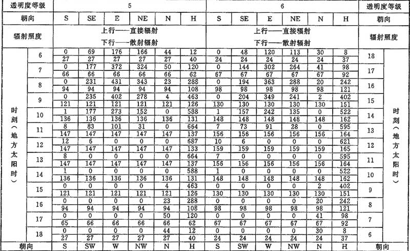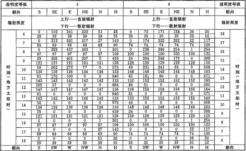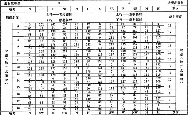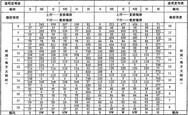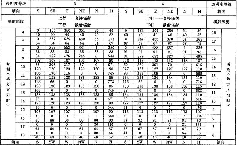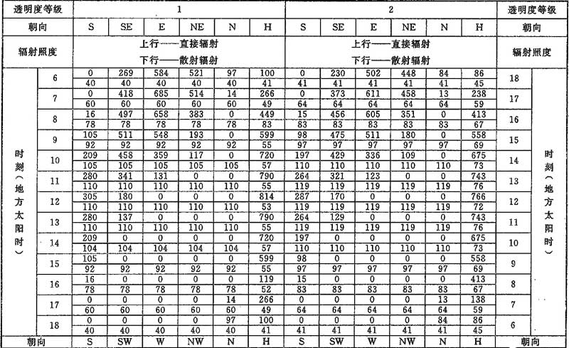 D.0.1 計算夏季空調(diào)冷負荷時,透過建筑物各朝向垂直面與水平面標準窗玻璃的太陽直接輻射照度和散射輻射照度應按表D.0.1-1~表D.0.1-7采用。