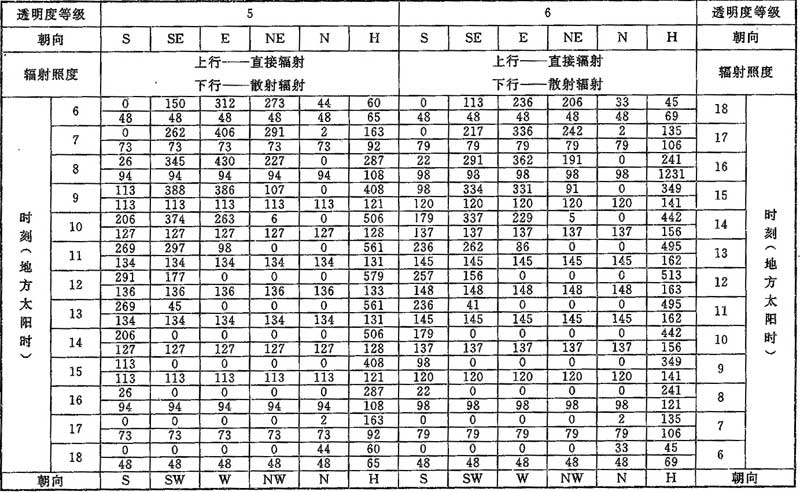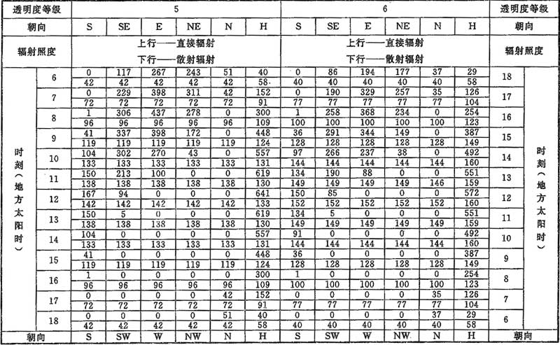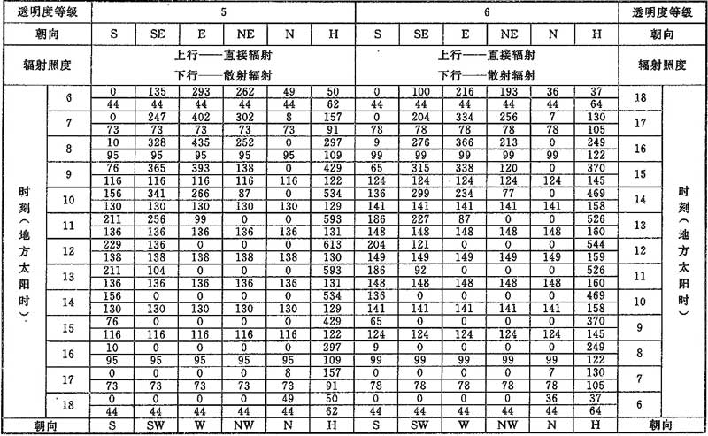 表D.0.1-6 北緯45°透過標準窗玻璃的太陽輻射照度(W/m2)