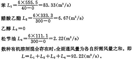 算例:某車間使用脫漆劑,每小時消耗量為4kg。脫漆劑成分為苯50%,醋酸乙酯30%,乙醇10%,松節(jié)油10%,求全面通風(fēng)所需的空氣量。