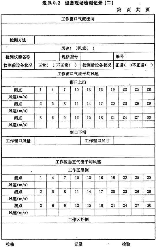 B.0.2 工作窗口氣流流向情況、風(fēng)速(或風(fēng)量)的檢測(cè)應(yīng)按表B.0.2進(jìn)行記錄。