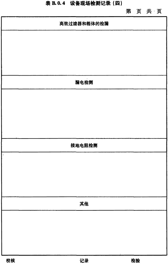 B.0.4 排風(fēng)高效過(guò)濾器的檢漏、生物安全柜箱體的檢漏、生物安全柜漏電檢測(cè)、接地電阻檢測(cè)等的檢測(cè)應(yīng)按表B.0.4進(jìn)行記錄。
