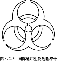 4.2.8 二級(jí)、三級(jí)、四級(jí)生物安全實(shí)驗(yàn)室的入口,應(yīng)明確標(biāo)示出生物防護(hù)級(jí)別、操作的致病性生物因子、實(shí)驗(yàn)室負(fù)責(zé)人姓名、緊急聯(lián)絡(luò)方式等,并應(yīng)標(biāo)示出國際通用生物危險(xiǎn)符號(hào)(圖4.2.8)。生物危險(xiǎn)符號(hào)應(yīng)按圖4.2.8繪制,顏色應(yīng)為黑色,背景為黃色。