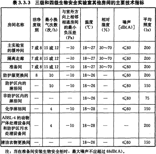 3.3.3 三級和四級生物安全實驗室其他房間的主要技術指標應符合表3.3.3的規(guī)定。