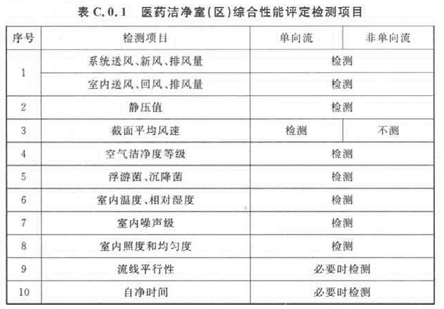 4 醫(yī)藥潔凈室(區(qū))的綜合性能確認(rèn),應(yīng)包括表C.0.1項目的檢測和評價。