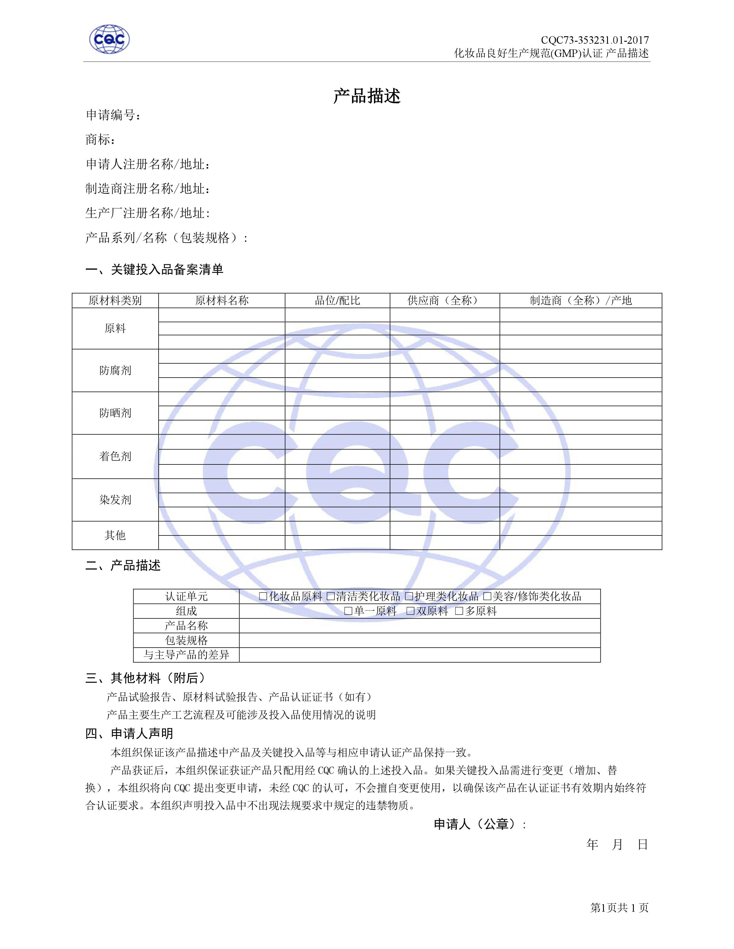 認(rèn)證依據(jù)為美國(guó)農(nóng)業(yè)部《Cosmetic Good Manufacturing Practice Guideline》, European Federation for Cosmetic Ingredients (EFfIC)-GMP for cosmetic ingredient,ISO 22716-2007《化妝品良好生產(chǎn)規(guī)范》、CQC73-353231-2016《化妝品認(rèn)證實(shí)施規(guī)則》及適用的法律法規(guī)等。